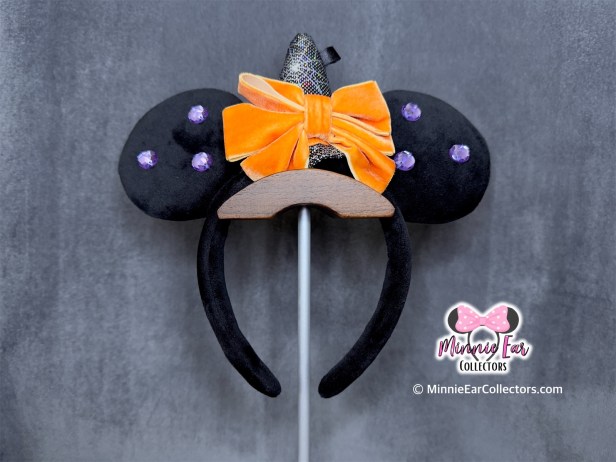 The Witch Halloween Ears release at Tokyo Disney Resort on September 19, 2024. The ears feature black fabric with purple gems on each ear. At the center is a gray/silver spiderweb witch hat with an orange bow.