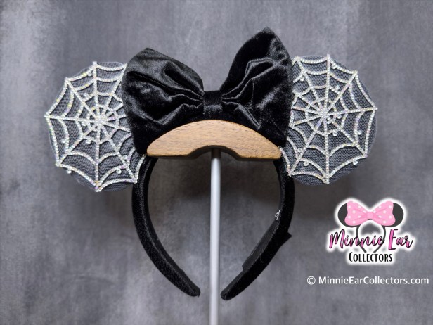 The ears feature a net like fabric on the ears with glass stones in the shape of a spider web. At the center is a black velvet-like bow.
