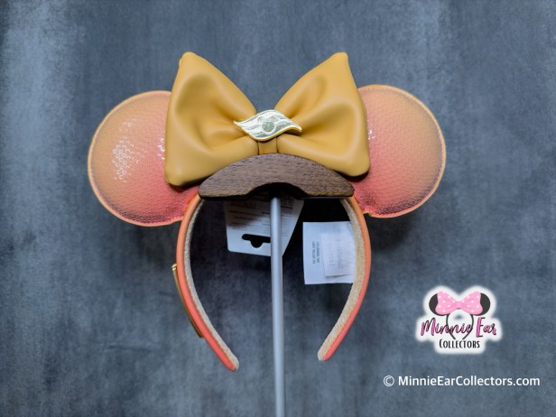 The Peach Ombre Disney Cruise Line Ears released on July 27, 2024. The ears a made of simulated leather with clear sequins sewn on top. At the center is a peachy, orange bow with the Disney Cruise Line emblem at the center.