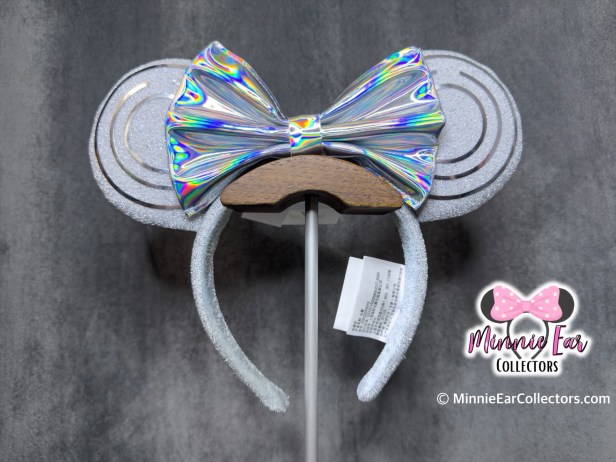 The Silver Tron Ears released at Shanghai Disney Resort on February 24, 2024. The ears are made of a textured silver fabric with circular “disk” holographic silver accents. The bow is a silver holographic material as well.