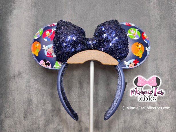 The ears are made of dark blue simulated leather with pictures of Mickey, Minnie, Donald, Daisy, Goofy, and Pluto. At the center of the ears is a matching dark blue sequin bow.