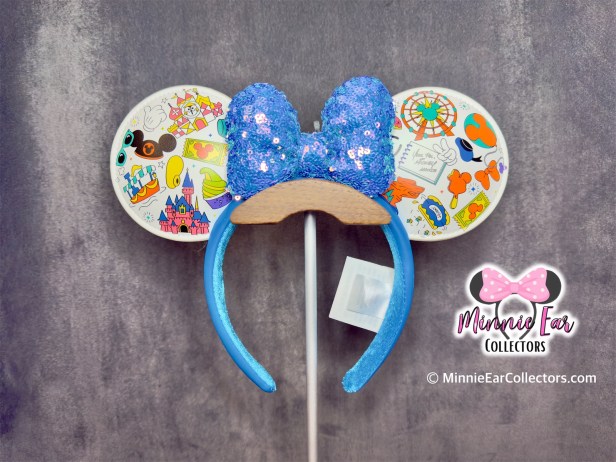 The ears are made of simulated leather and feature an allover print of Disneyland and parks icons. A nearly identical collection was released for Walt Disney World.