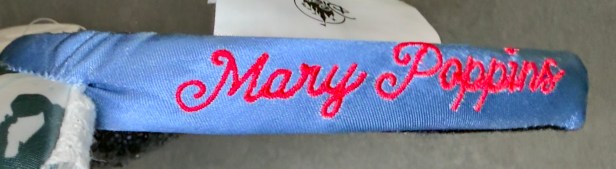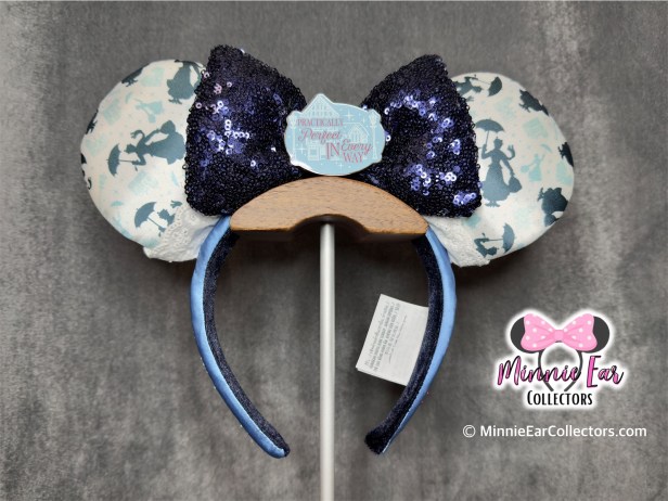 The Mary Poppins EPCOT World Showcase United Kingdom Ears released on October 24, 2024. The ears are a satin allover Mary Poppins print adorned with white lace at the bottom. There is navy sequin bow with a metal emblem that reads “Practically Perfect in Every Way.” The side of the headband is embroidered with Mary Poppins on one side and EPCOT United Kingdom on the other.