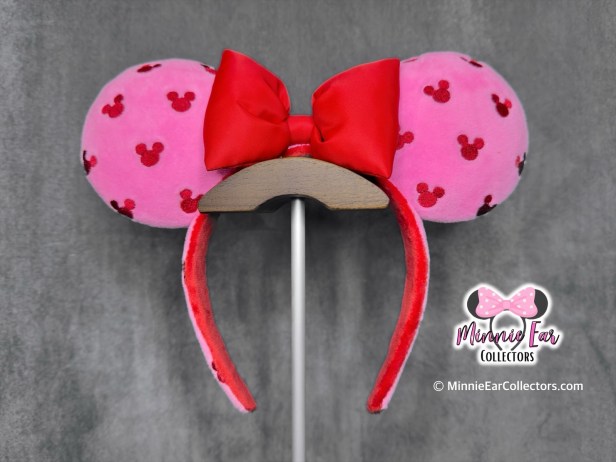 The ears feature a pink plush fabric with embroidered red Mickeys allover. The inside of the headband is lined with a matching plush red fabric. The ears are finished with a plush red bow.
