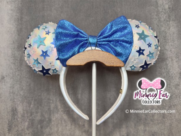 The padded ears are covered in silver holographic vegan leather. The ears are covered in various shades and sizes of blue leather stars with glass stones. A glitter silver bow is at the center of the ears.