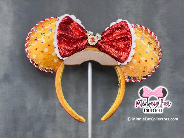 The gingerbread padded ears feature colorful beads and jewels embellishing “icing” details along the top and bottom of the ears. The ears are also scattered with snowflakes on each side. A red and white peppermint piping accentuates the edge of the ears while a red sequin bow with a white scalloped bow sits at the center of the ears. A jeweled Mickey completes the detail of the bow at the center.