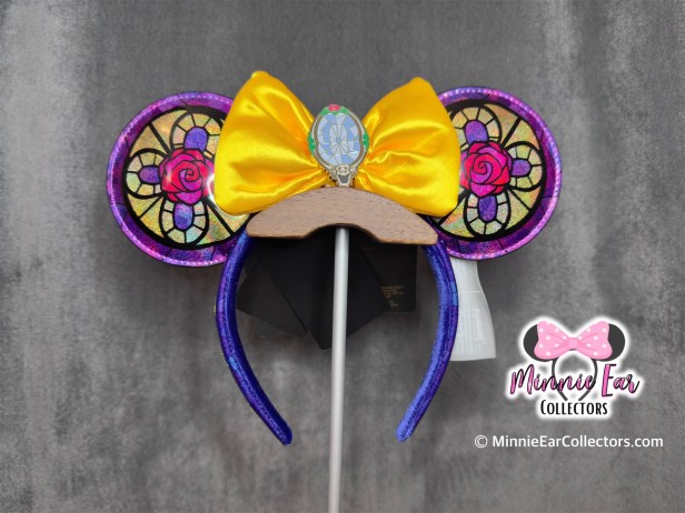 The ears are made of vinyl leather with stained glass rose details on the front with “Belle” printed on the back of one ear and roses on the other. A yellow satin bow with a mirror emblem is at the center of the ears. The Loungefly logo is embroidered on the side of the headband. Though not released on the website, the ears are limited edition of 1,100. A matching Loungefly mini backpack was also released.