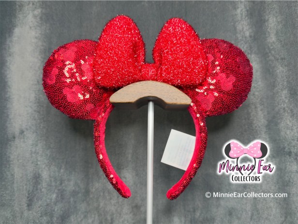 The ears are covered in a vibrant red sequin that is inlaid with a subtle red Mickey polka dot print. A shimmering red bow with metallic threads completes the ears at the center. The ears were released alongside a matching Loungefly mini backpack.