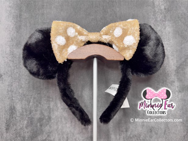 The Hong Kong Disneyland Polka Dot Gold Bow Ears released in Hong Kong Disneyland on October 25, 2024. The plush ears are covered in a soft, fuzzy fabric. A gold and white polka dot bow completes the look. The ears are exclusive to Hong Kong Disneyland and feature the Hong Kong Disneyland fabric tag.