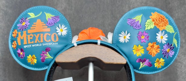 The teal faux leather ears are covered with purple, orange, yellow, and white embroidered flowers on the front and back with Mexico EPCOT World Showcase printed on the back. Matching silk flowers adorn the center of the ears along the headband. A metal Loungefly plaque is affixed tot he side of the headband.