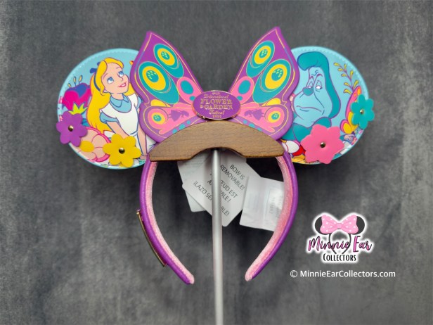The simulated leather ears feature printed art on both sides features Alice, Caterpillar and live flowers with floral appliqués with metal centers scattered around the front. There is a removable butterfly wings bow with snap closure at the center with a cloisonné ”EPCOT International Flower & Garden Festival 2025” cameo at the center. There is a Loungefly plaque on the side of the headband.