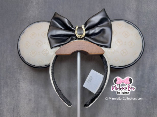 The Disney’s Saratoga Springs Resort & Spa Ears were released at the Saratoga Springs Resort in Walt Disney World on March 13, 2025. The ears are made of simulated leather and feature an allover debossing print themed with horses and ribbons to match the theming of the resort. The edge of the ears has a black pipping that matches the black bow. There is a horseshoe emblem at the center of the bow. The headband is printed with “Disney’s Saratoga Springs Resort & Spa.”