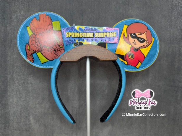 The 2025 Springtime Surprise runDisney Ears released on April 3, 2025 at the runDisney Expo. The are made of faux leather with various heroes like Groot and Mrs. Incredible of the front and back. A placard of the race sits at the center of the ears in lieu of a bow. The side of the ears is printed with “Walt Disney World” on one side and “Disney Celebrates Heroes!” on the other.
