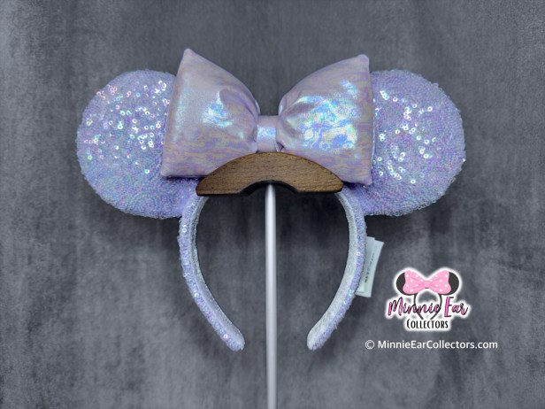 The ears are made of a light purple allover purple opalescent sequin. The ears are topped off with a matching purple opalescent satin bow.