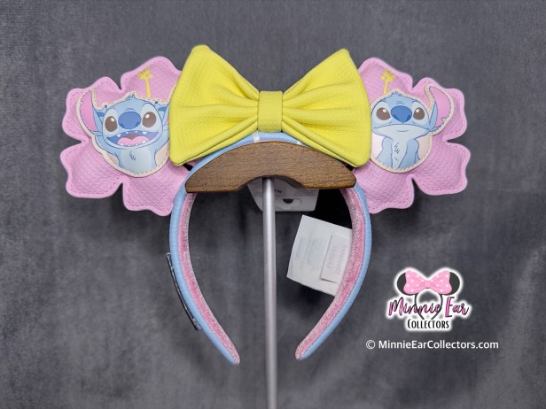 The headband features a plush, light pink base with a bright yellow bow centered between two beautiful hibiscus shaped ears. Each ear showcases the one and only Stitch. One ear captures Stitch with a happy expression and outstretched arms, while the other depicts him in a more serious pose.