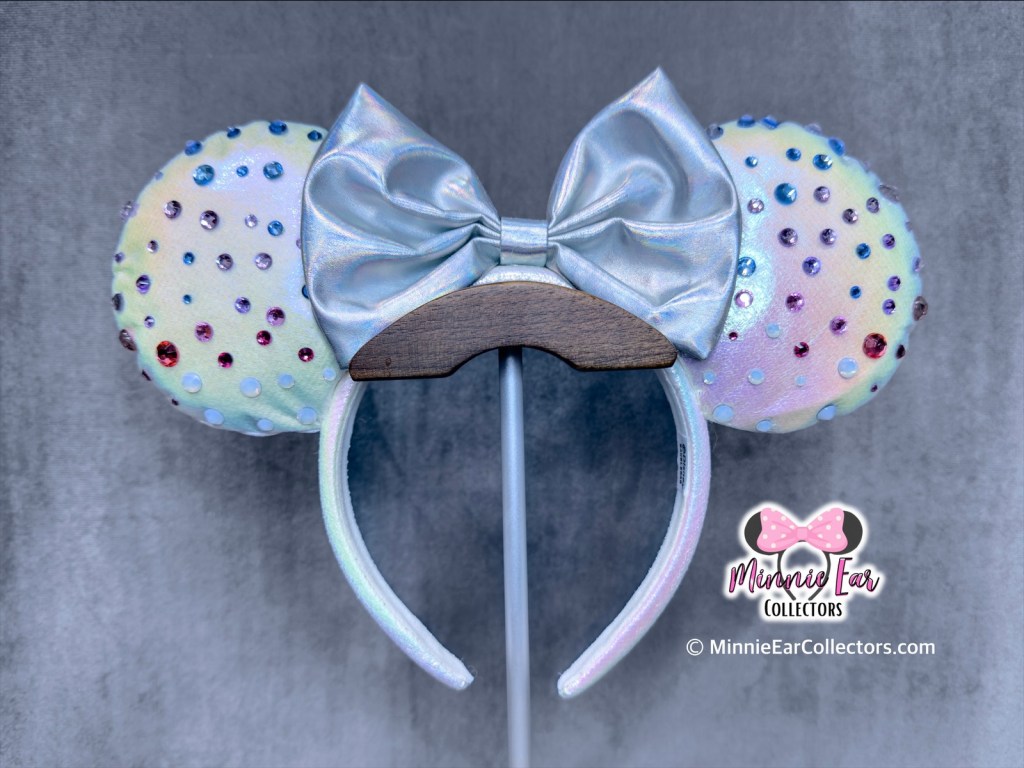 These ears feature glossy, iridescent white ears with rainbow crystals that add magical pops of color. The ears are topped with a plush silvery-white bow.