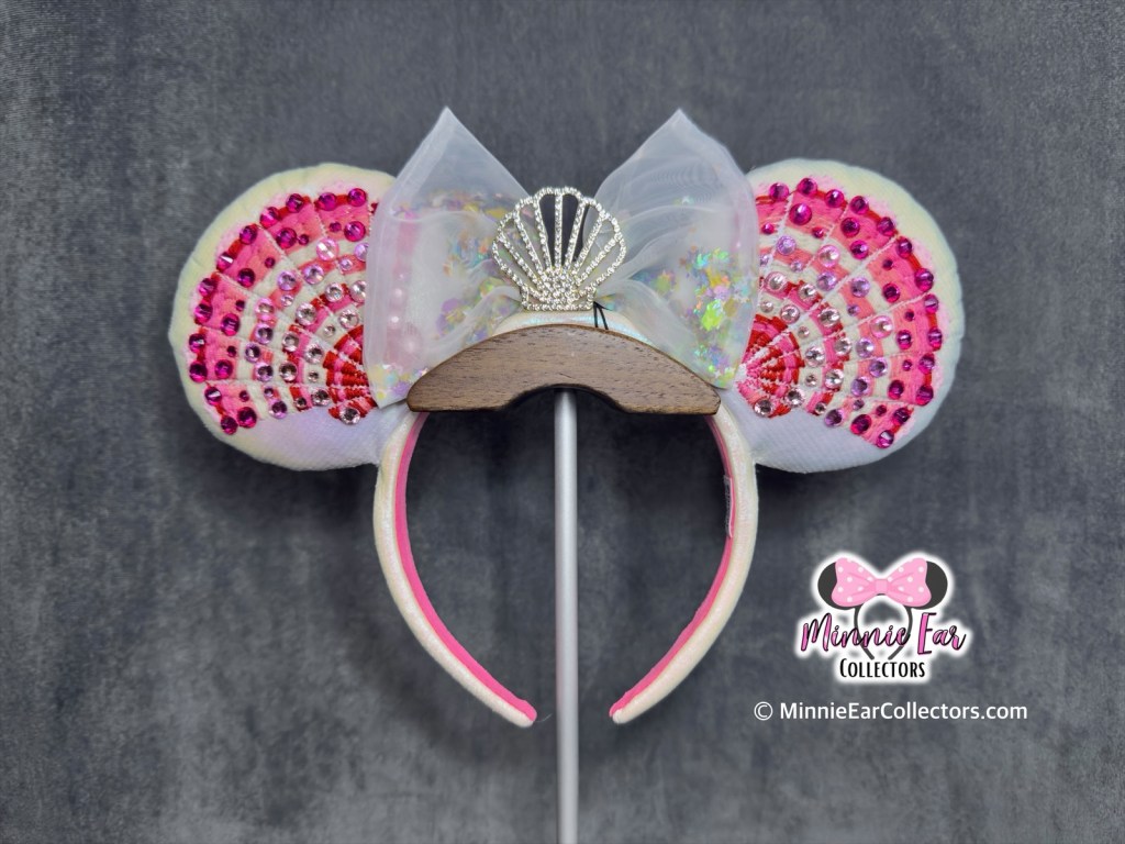 Make a splash with these shimmer pink Disney ears — sparkly and sea-inspired for summertime adventures. The iridescent ears are embroidered with a bright pink crystal shell pattern. At the center of the ears is a tulle bow with a sparkling shell at the center. Loose multicolored sequins inside the bow that shake as you move