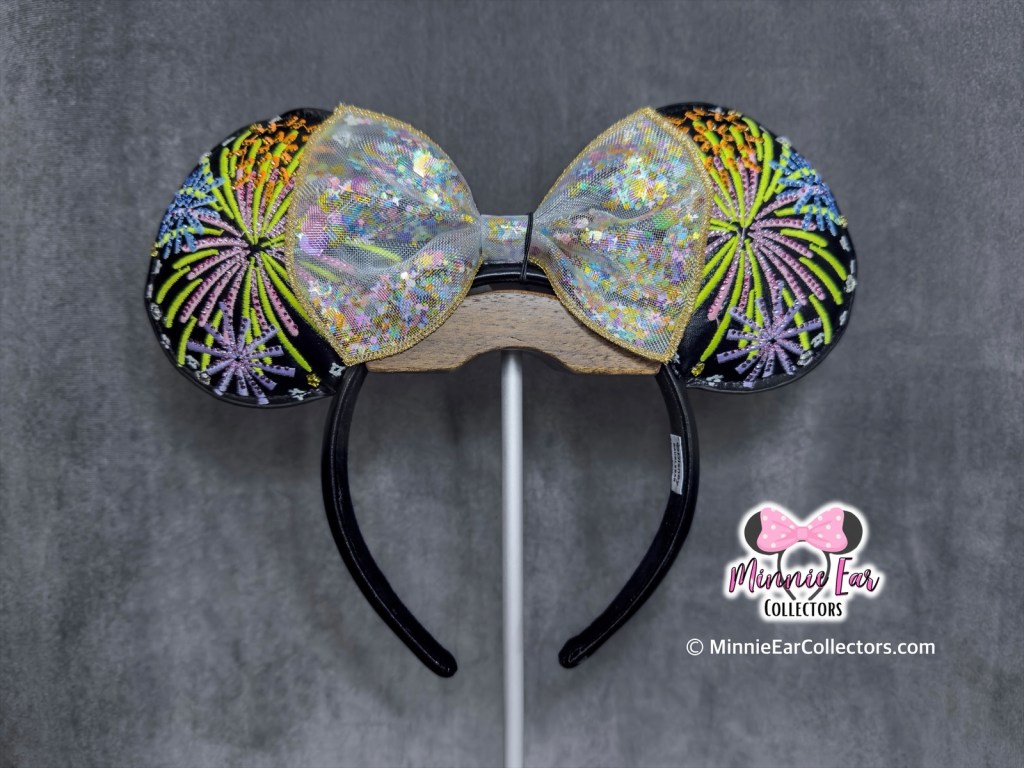 The faux leather ears are covered in embroidered and gemstoned fireworks which also feature a glow in the dark effect for that extra wow factor. A sheer, holographic bow sits at the center of the ears. The bow also contains loose sequins inside that provide a shaker effect.