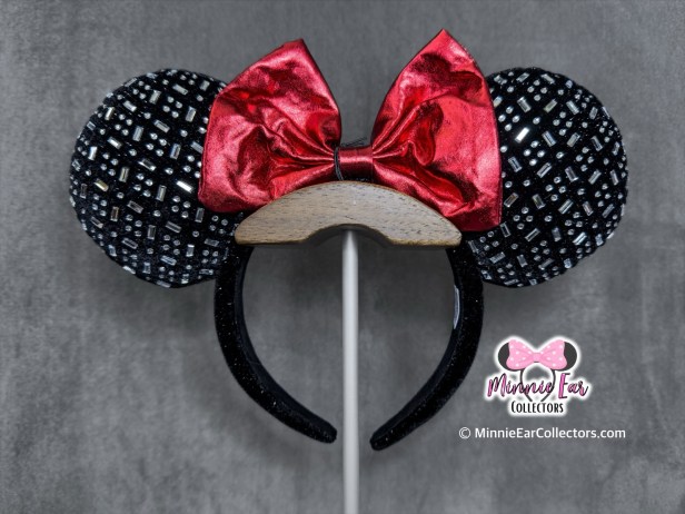 The BaubleBar Minnie Mouse Glam Ears feature black ears with a shimmer and red bow, but with a glam, bedazzled twist.