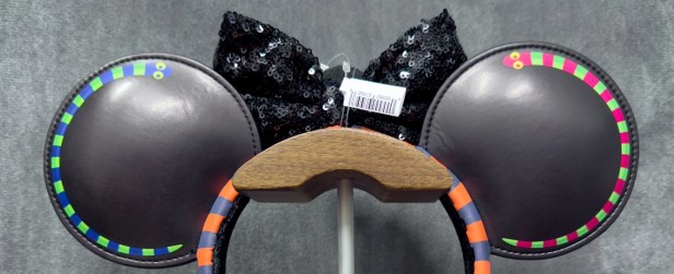 The ears are made of a black faux leather which is printed with a Jack Skellington pumpkin face on the front of each ear. The back of the ears has a snake design around each side. There is a black sequin bow at the center with Jack Skellington’s face and “Pumpkin King.”