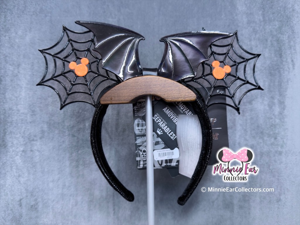 The ears are black plastic spider-webs with orange Mickey emblems in the center of the webs. A black, removable “Bat Bow” completes the ears.