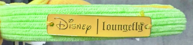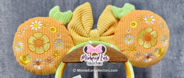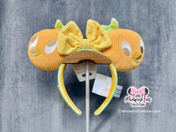 The ears and headband are made from brightly colored, citrus-themed corduroy. The orange ears feature the embroidered face of the Orange Bid on the front and a circular floral design on the back. A yellow corduroy boy sits in the middle of the two Orange Bird faces. The headband is made of green corduroy as is the Orange Bird’s leaves at the top of the ears. The side of the headband is adorned with an orange Loungefly plaque.