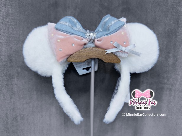 The Donald Duck Birthday Ears released exclusively at the Shanghai Disney Resort on May 29, 2025 as part of the 2025 Donald Duck birthday merchandise collection. The ears are made of a white fuzzy material. A light pink bow adorned with rhinestones and a light blue bow adorned with ribbons sits at the center of the ears. The side of the headband is embroidered with “Shanghai Disney Resort.”