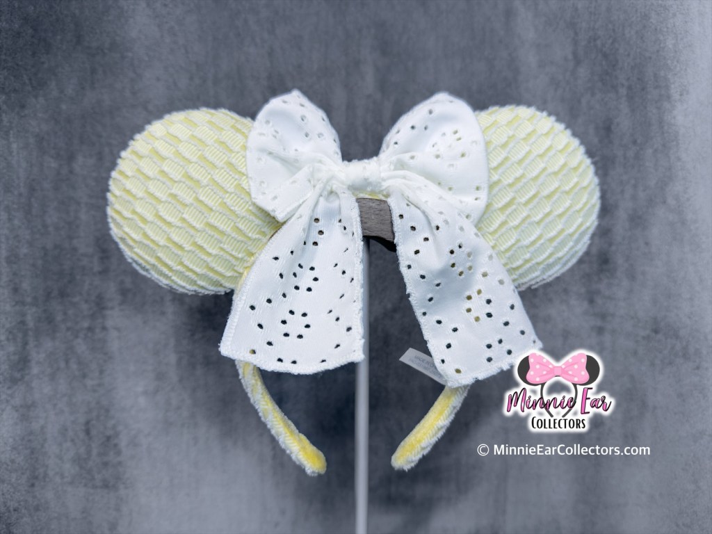 The Light Yellow Lace Ears release at Tokyo Disney Resort on July 17, 2025. The ears are made of a light yellow textured fabric that covers both the ears and the headband. A big white lace bow sits at the center of the ears. The extra large bow allows for the wearer to decide to wear the bow towards the front or the back.