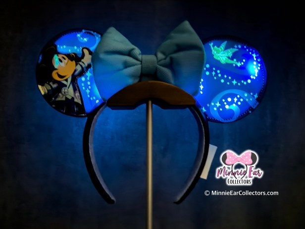 Get ready to dream the night away in true Disney fashion with the Disney Starlight Parade Ears. One ear features Mickey Mouse in his Starlight parade outfit, ready to lead the magic. The other ear sparkles with Tinker Bell and swirls of pixie dust. The design is set against a dreamy deep blue and purple backdrop which is perfectly accented by a sky-blue removable bow. The ears also feature a light up element that is similar to other recently released ears. By pressing along the top of the headband, the ears can be rotated through a series of solid colors, color changing, and color changing flashing and sparkling.