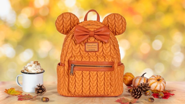 The backpack features the same faux-knitted orange pattern, giving it that cozy sweater look we’re all obsessed with. Accents of faux leather trim add structure and style, while the front is topped with an adorable Minnie bow that mirrors the ears and ties the whole look together, literally and fashionably.