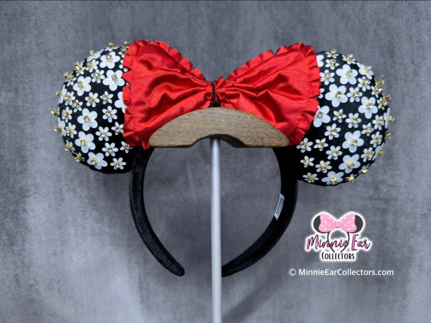 The BaubleBar Minnie Mouse Polka Dot Ears feature plush black ears accented with white florals. The flowers are decorated with crystal appliqués to add extra sparkle. The ears are finished with a plush red bow, designed with a ruffle trim.