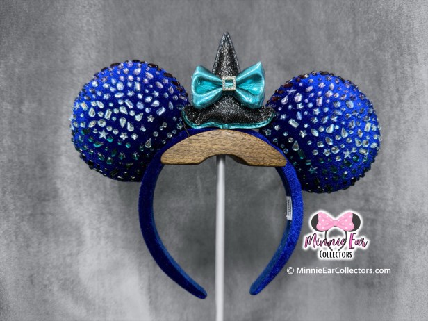 The plush bright blue ears embellished with multishaped blue crystals. The ears are topped off with a glittery witch hat that features Minnie’s signature bow.
