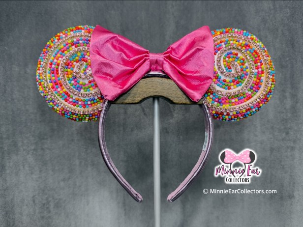 The padded ears are studded with colorful beaded “sprinkles” that are spiraled with pink gems. A pink satin bow sits at the center of the ears while the headband is covered in pink lame fabric.