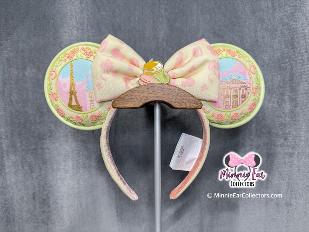 The ears feature a light green and pink floral embossed pattern around the outside of the ears with a picture of the Eiffel Tower printed on one ear. The bow and back of the ears has an allover print with Minnie and bakery themed elements. There is a metal macaron emblem at the center of the ears.