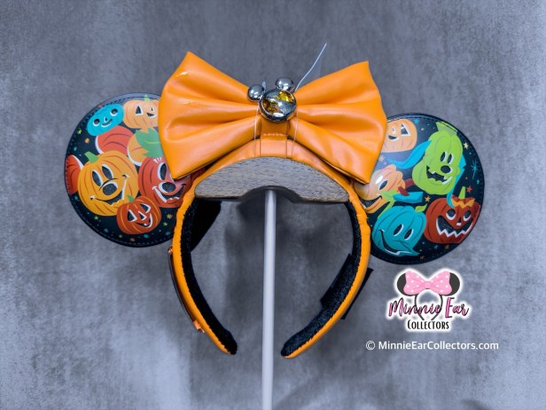 The faux leather ears are printed a variety of character and regular pumpkins with internal light up elements. A removable orange leather bow rests at the center of the ears with a silver metal DVC emblem that is adorned with a shimmery orange jewel.