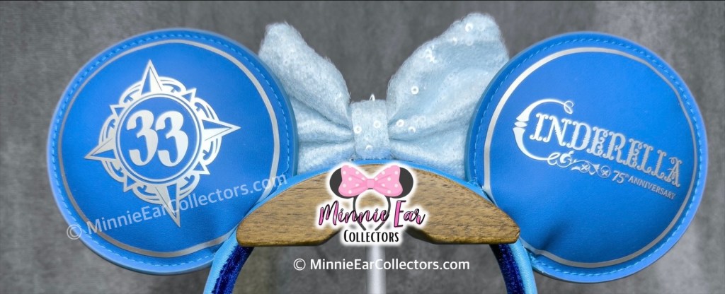 The Walt Disney World Club 33 Cinderella 75th Anniversary Loungefly Ears were released at Club 33 in Walt Disney World in February 2025. The ears are made of blue simulated leather with a printing of Cinderella in her ballgown adorned with rhinestones on one ear and Cinderella Castle and her pumpkin carriage on the other ear. The back of the ears is printed with the Walt Disney World Club 33 logo on one ear and “Cinderella 75th Anniversary” on the other ear. There is a silvery-blue sequin bow with a blue and silver Club 33 plaque at the center of the bow. The side of the headband is also accentuated with a Loungefly plaque.
