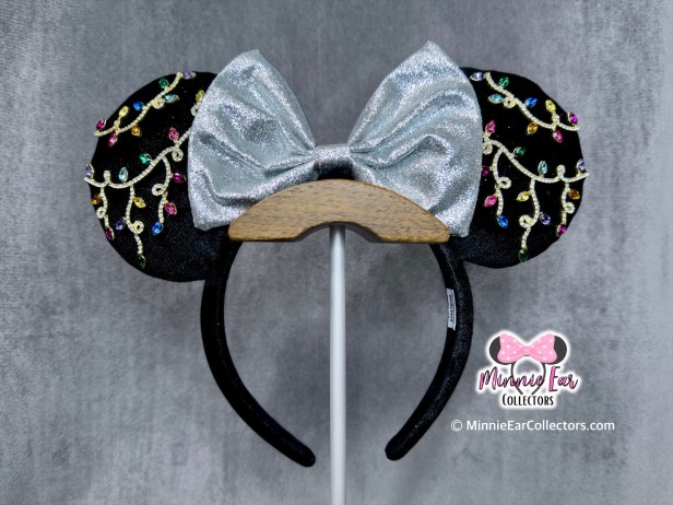 The plush black velvet ears are “wrapped” in brightly colored gemstone string lights. The ears are topped with a glittering silver bow.