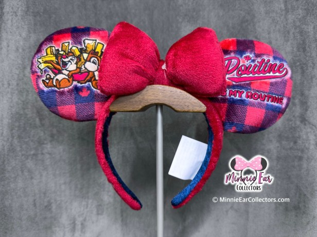 The ears are made of a plush red and black buffalo plaid fabric with red maple leaves in the black squares. The front of the ears feature two patches – one with Chip and Dale and french fries on one ear and “Poutine is my routine” on the other ear. The ears are finished with a plush red bow.