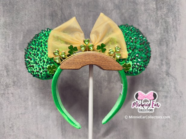 The ears are made of green satin that is covered with green crystals. The ears are topped with a gold mesh bow and a crystal shamrock crown.