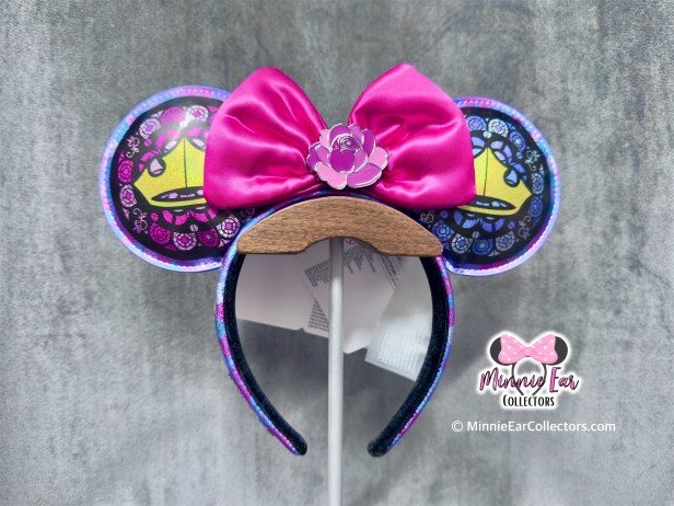 The ears are made of vinyl leather with stained glass crown details on the front. A bright pink satin bow with a flower emblem is at the center of the ears. The Loungefly logo is embroidered on the side of the headband. There are no details about the ears being limited edition like other previous releases. A matching Loungefly mini backpack was also released.