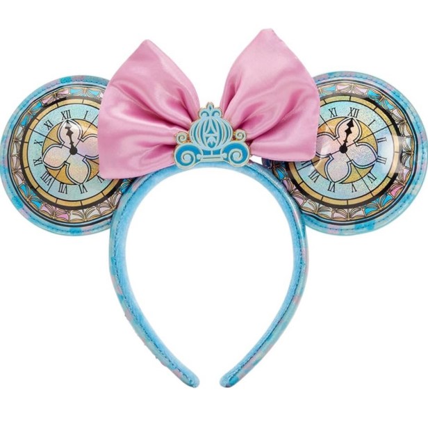 The ears are made of vinyl leather with stained glass clock details on the front. A light pink satin bow with a pumpkin carriage emblem is at the center of the ears. The Loungefly logo is embroidered on the side of the headband. There are no details about the ears being limited edition like other previous releases. A matching Loungefly mini backpack was also released.