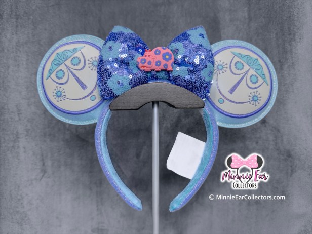 These ears are a pastel dream, pulling inspiration from the iconic Mary Blair art style and the whimsical characters found throughout the ride. The ears themselves feature a soft, shimmering aqua-colored background. Each ear showcases the famous smiling clock face from the ride’s exterior, rendered in sparkly purple and white with delicate embroidered borders. This is where the sparkle really happens! The bow is covered in dual-toned sequins—vibrant purple mixed with pops of bright blue. Sitting right in the middle of the bow is the star of the show: a pink silicone hippo! This fan-favorite character from the the ride is detailed with tiny purple flowers, adding a 3D pop of personality to the headband. The outer headband matches the purple of the bow with a glittery finish, while the interior is lined with a soft aqua velour for a comfortable fit during your park hop.