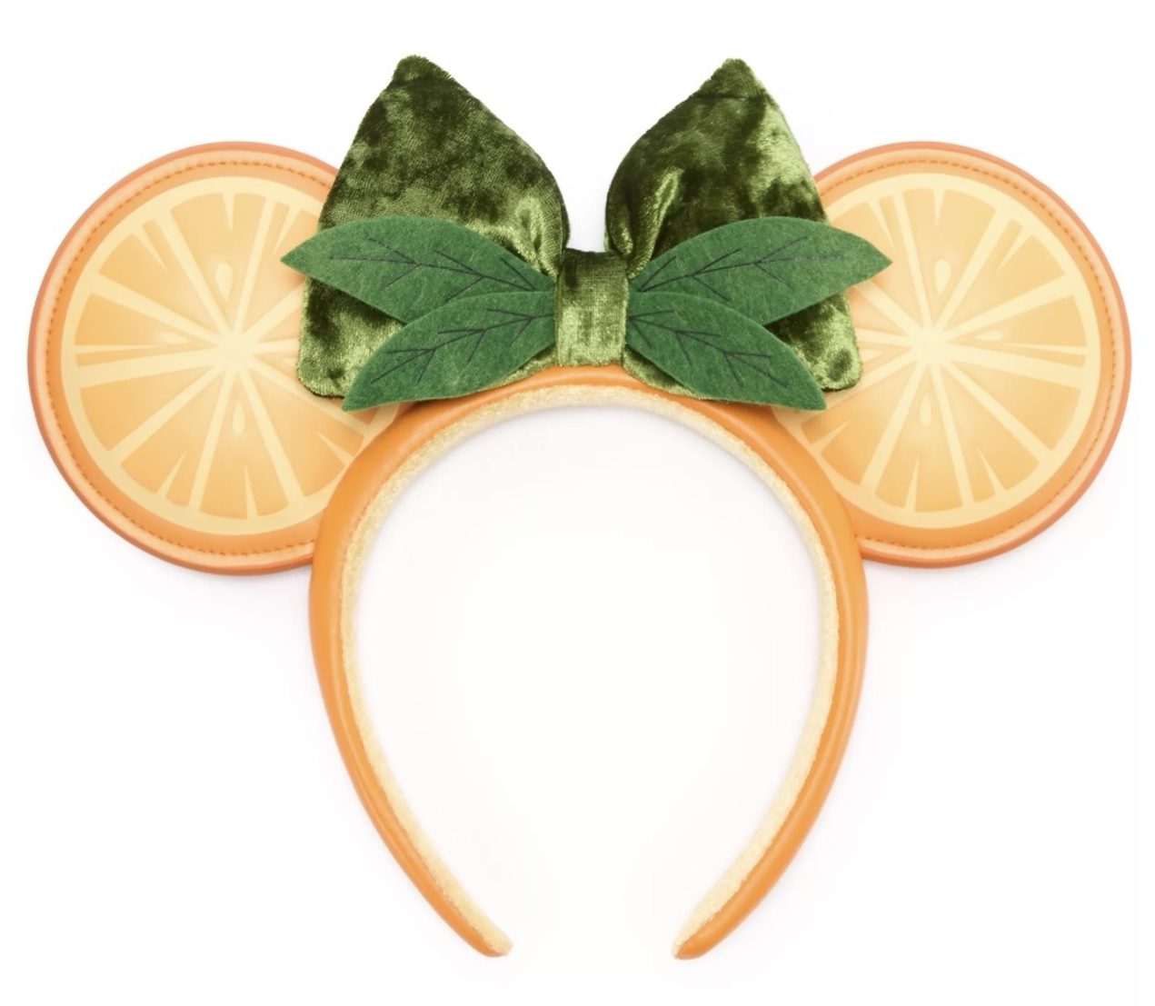 This pair leans into a bright, photorealistic aesthetic that looks good enough to eat (though we definitely don’t recommend it!). The stars of the show are two large, translucent-like orange slices. They feature realistic “pulp” detailing and a textured rind that catches the sunlight beautifully, giving them a glowing, sun-ripened appearance. Keeping with the garden-fresh theme, the bow is crafted from a rich green velvet. It’s tied in a classic style that mimics the look of orange leaves, providing a perfect color contrast to the bright orange ears. The headband is covered in a matching green non-slip velour, ensuring that your “vitamin C” stays perfectly in place while you’re park hopping.