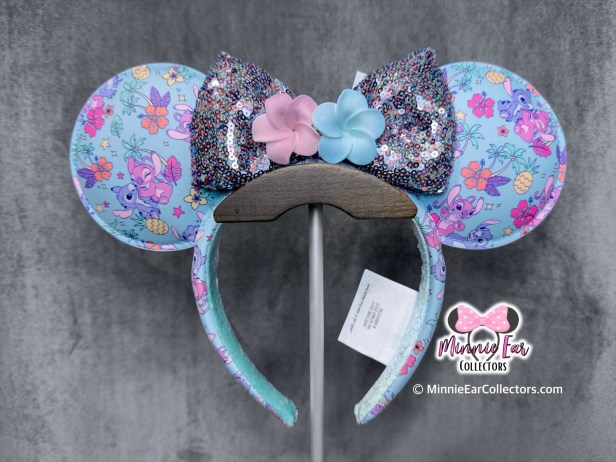 These ears are a tropical explosion of color, featuring the galaxy’s favorite chaotic couple against a beautiful island backdrop. The ears are made from a smooth, light-blue faux leather covered in an all-over print. You’ll find Stitch and Angel sharing sweet moments among pink hibiscus flowers, tropical palm leaves, and golden pineapples. Taking center stage is a stunning multi-colored sequin bow that shifts between silver, blue, and pink. In place of a traditional knot, the bow is adorned with two 3D rubber plumeria flowers—one soft pink and one pastel blue—perfectly tying the Stitch and Angel color palette together. The exterior of the headband features the same adorable tropical print as the ears, while the interior is lined with a mint green non-slip velour to keep your ears secure while you’re riding Lilo & Stitch’s Island Favorites (or just grabbing a Dole Whip!).