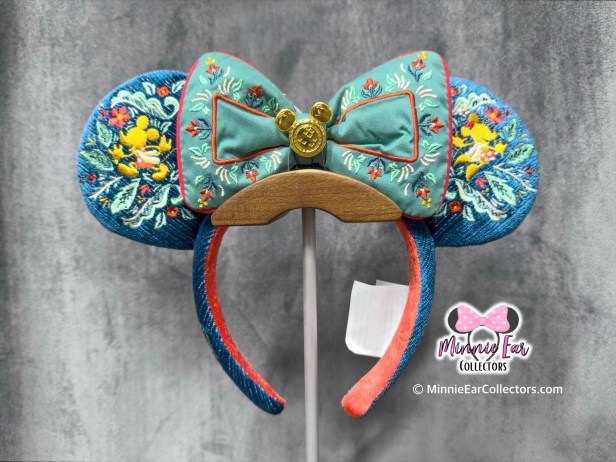These ears offer a soft, boutique feel that highlights the heritage of Norway. The ears are made from a rich, blue fabric and feature intricate, multi-colored embroidery. On one side, you’ll find Mickey Mouse dressed in traditional Norwegian attire, surrounded by vibrant floral “Rosemaling” patterns. The other ear features Minnie Mouse in her own folk-inspired outfit, nestled within a matching garden of stitched red and yellow blossoms.